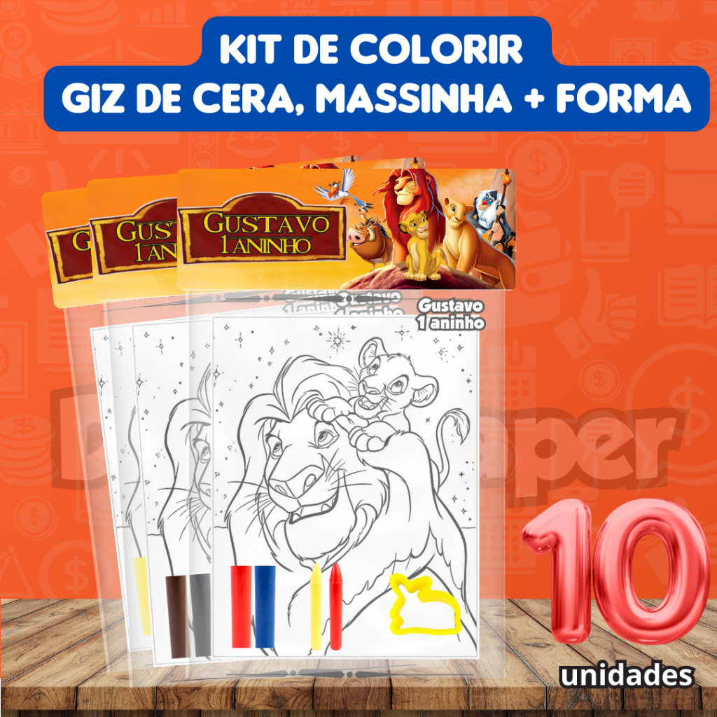 Kit de Colorir Rei Leão com Giz de cera massinha e forma - Lembrancinha 10 unidades