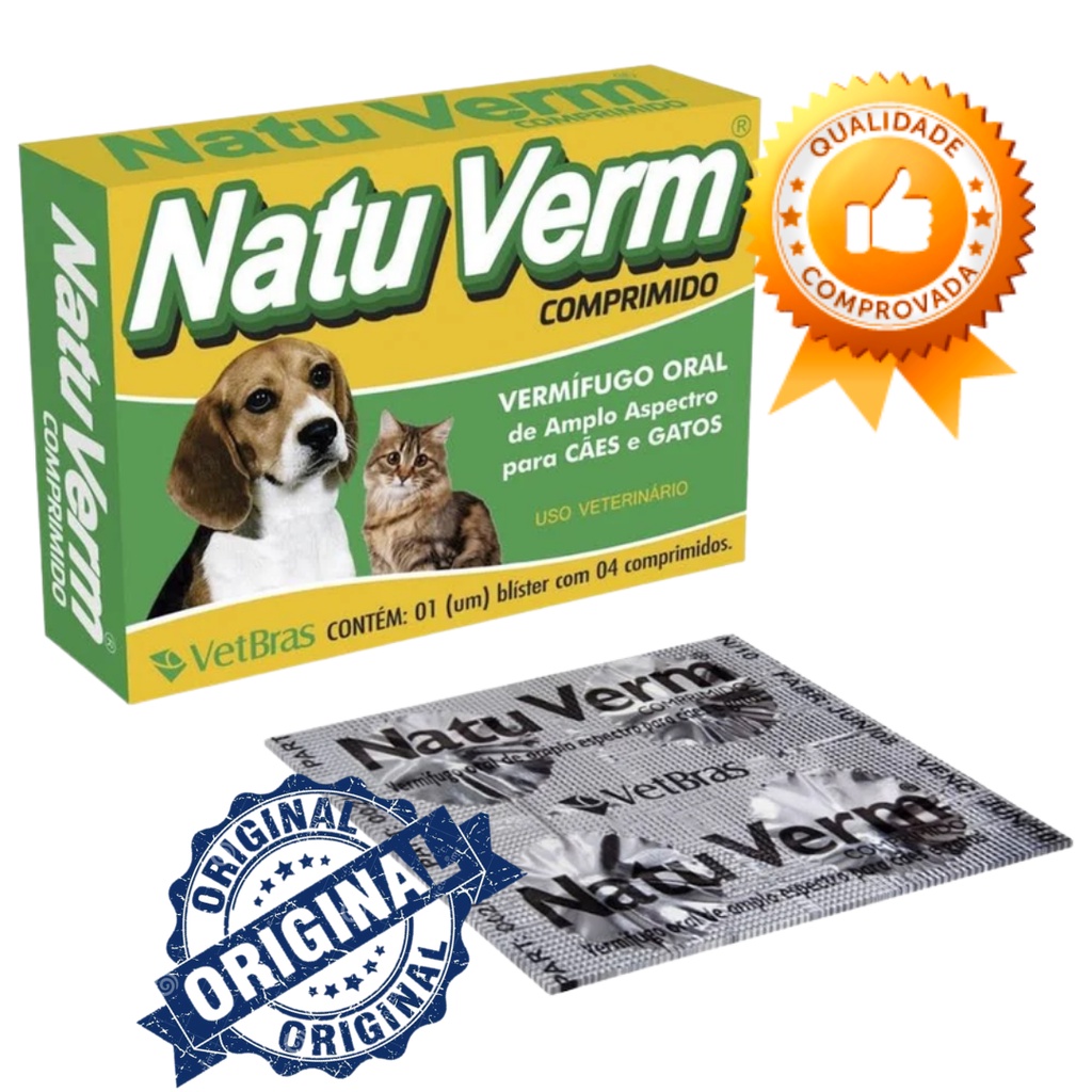 Remédio Para Carrapato, Pulga e Sarna Natu Verm c/4 comprimidos para Cães e Gatos Vermífugo Oral Dose Única