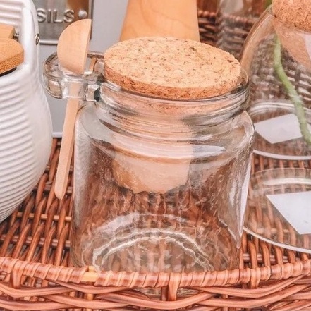 Pote de Vidro com Tampa de Rolha Cortiça e Colher Bambu Madeira | Porta Temperos Mantimentos 60ml