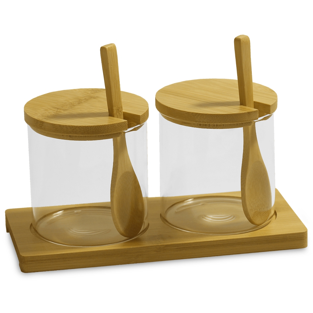 Kit 2 Pote de Vidro com Tampa Bambu 300ml Porta Temperos Condimentos Saleiro + Suporte e Colher