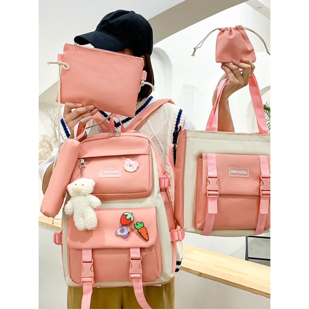 Kit Mochila 5 Peças Conjunto Bolsas Feminina Estojo Escolar Com Chaveiro Urso