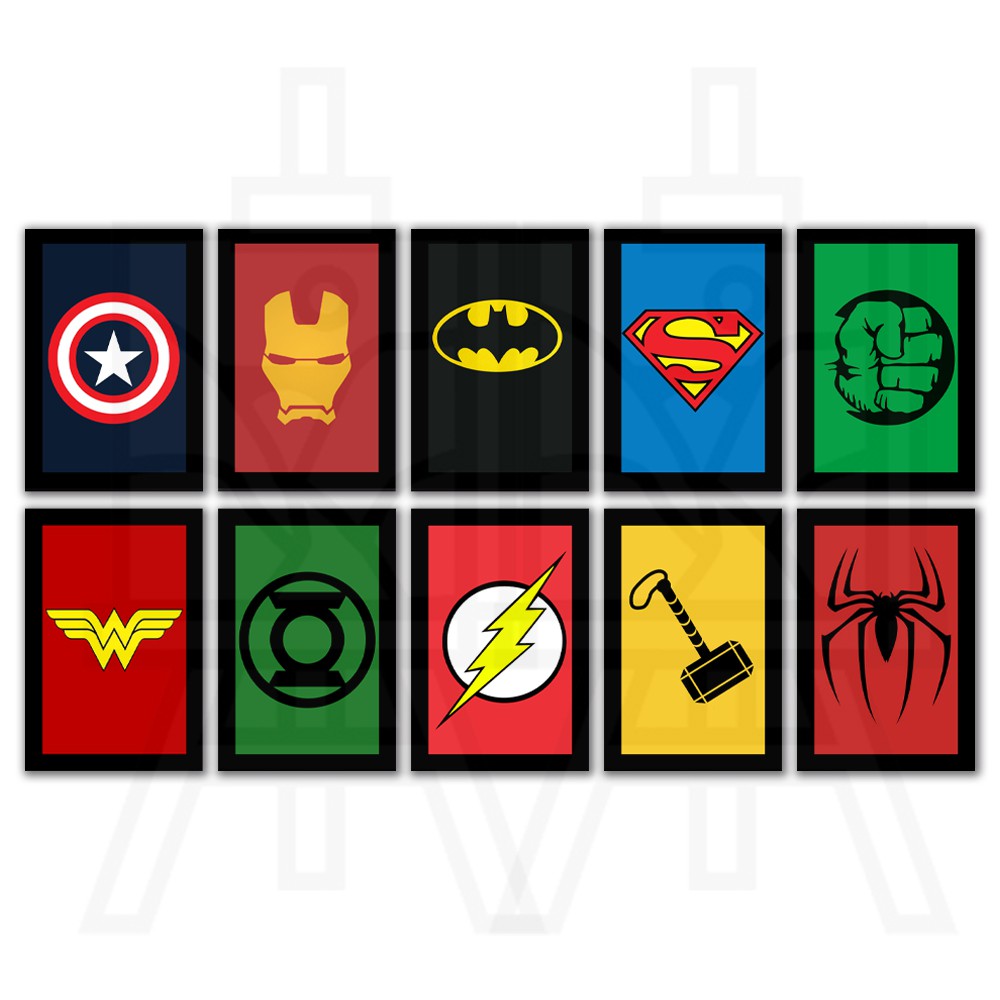 Kit Quadros Decorativos Mosaico 10 Peças Super Heróis Marvel Capitão América Homem de Ferro Batman Super Man Hulk Mulher Maravilha Lanterna Verde Flash Home Aranha Thor Painel Quarto Infantil Criança Dc