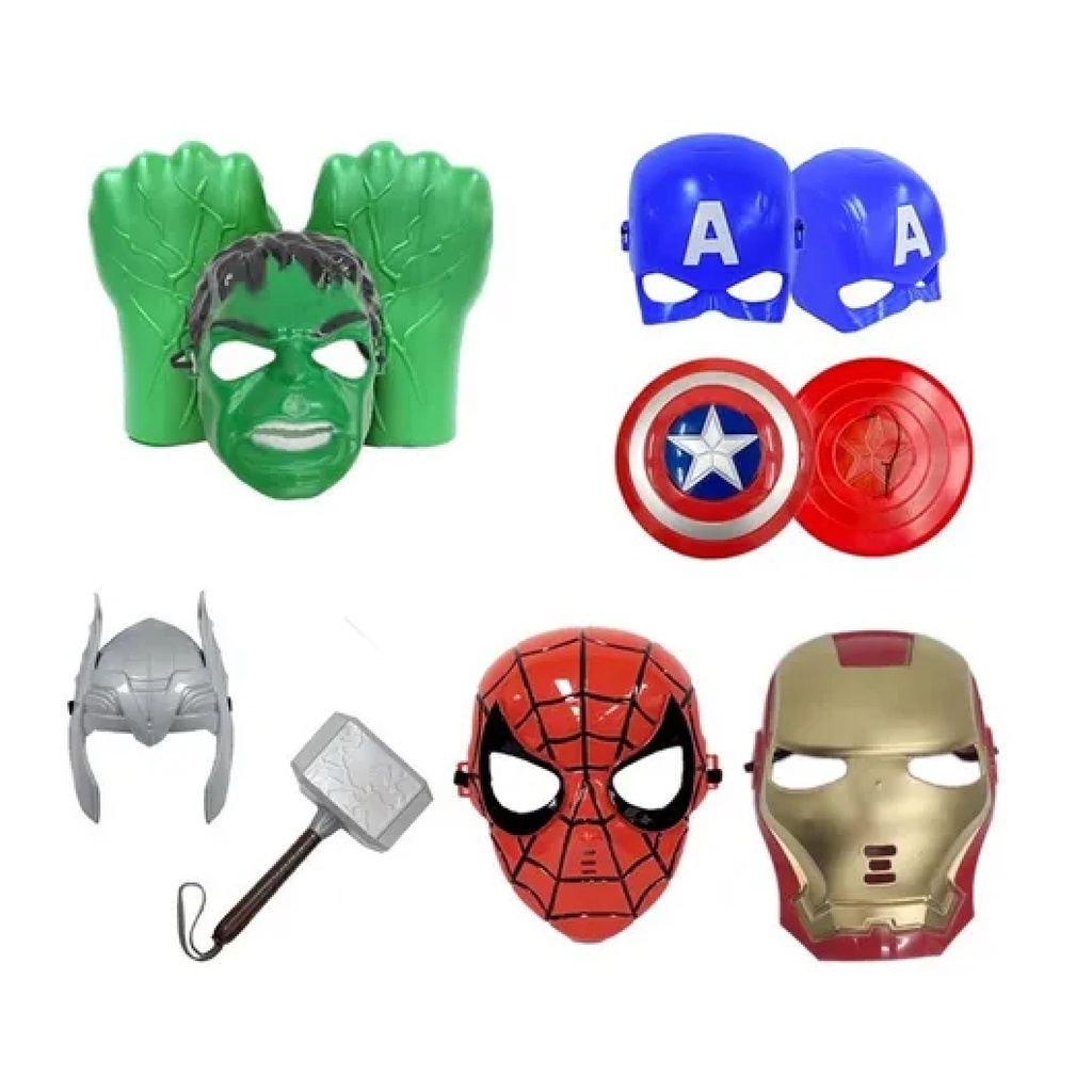 Kit LUXO Brinquedo 08 peças: Marreta e Máscara Thor + Escudo e Máscara Capitão América + Par de Luvas Hulk e Máscara + Máscara Homem de Ferro + Máscara Homem Aranha