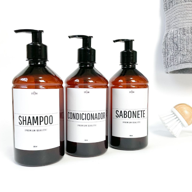 Kit Banheiro Minimal Shampoo Condicionador E Sabonete Frasco Dispenser Âmbar Banheiro Sanchz Design