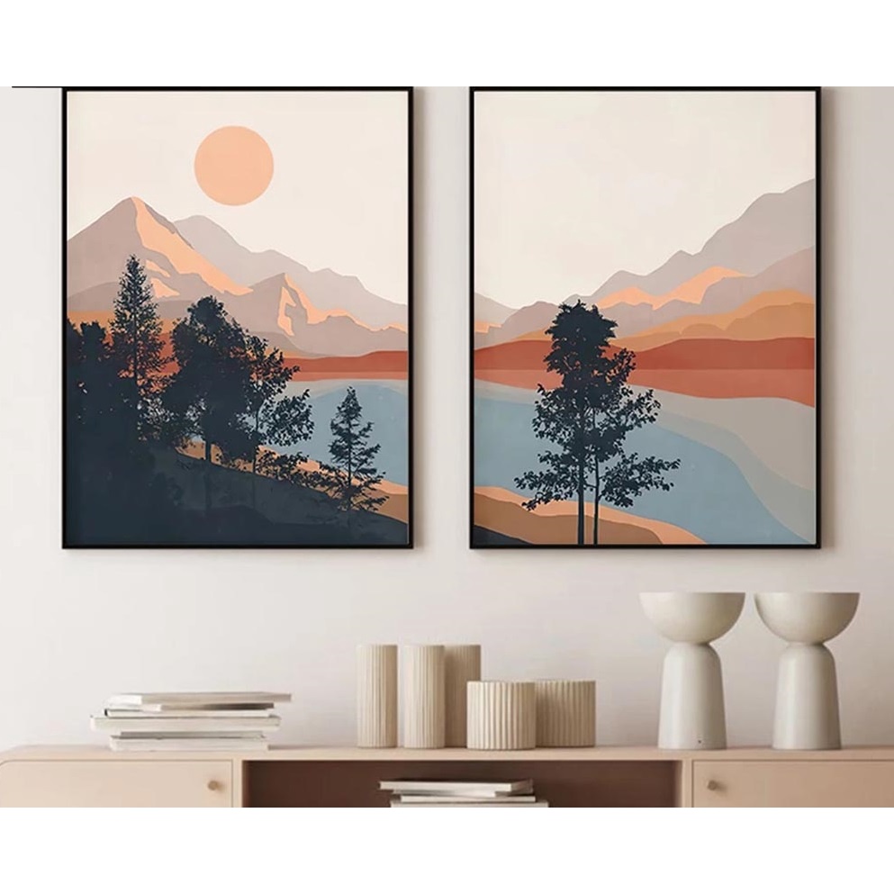 Quadro decorativo 2 peças 40x60 boho paisagem moderno abstrato montanha sol pinheiro nórdico para sala quarto