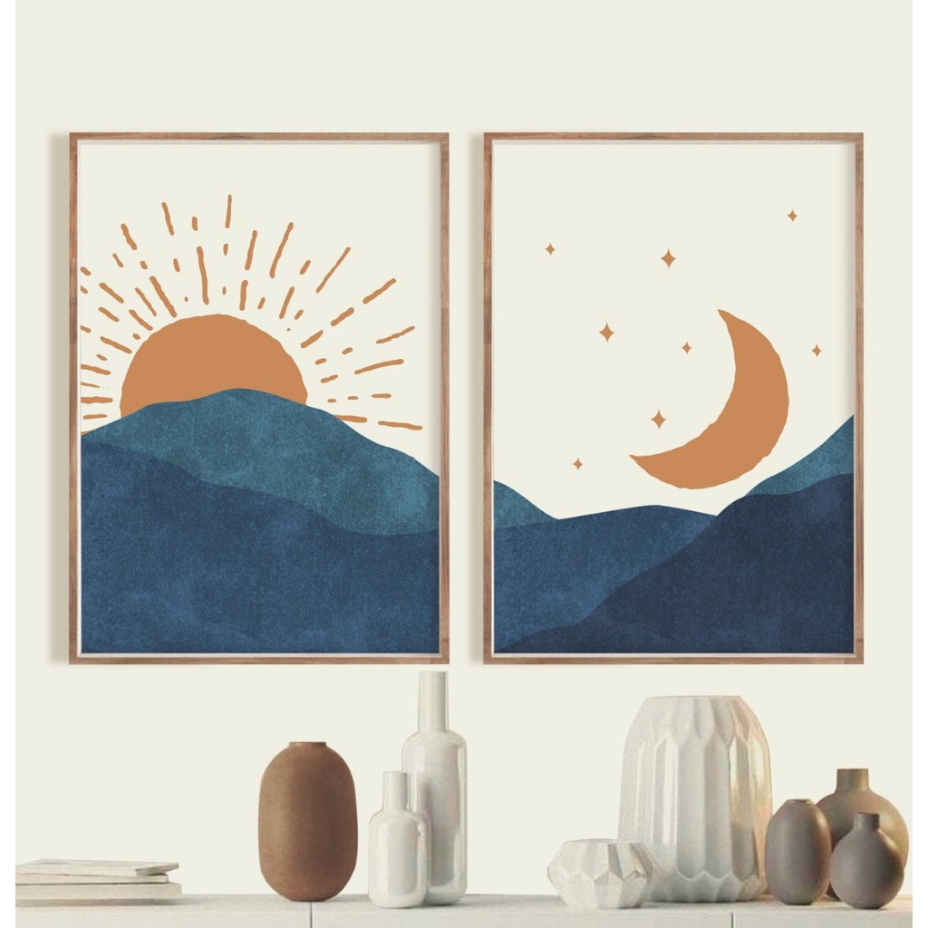 Quadro decorativo 2 peças 40x60 boho sol e lua atras do monte decoração para casa sala quarto hall