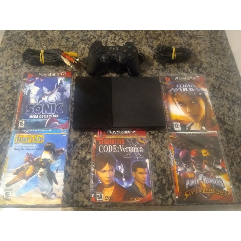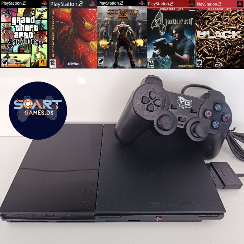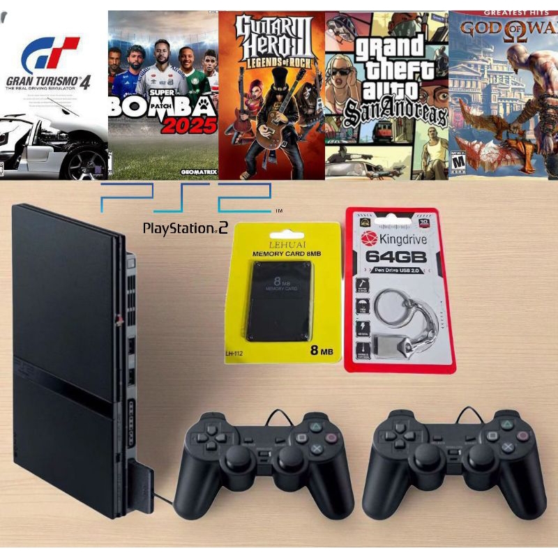 PlayStation 2 Slim, Desbloqueado, Leitor Funcional - 3 Controles, 2 Originais, Memory Card, 5 Jogos