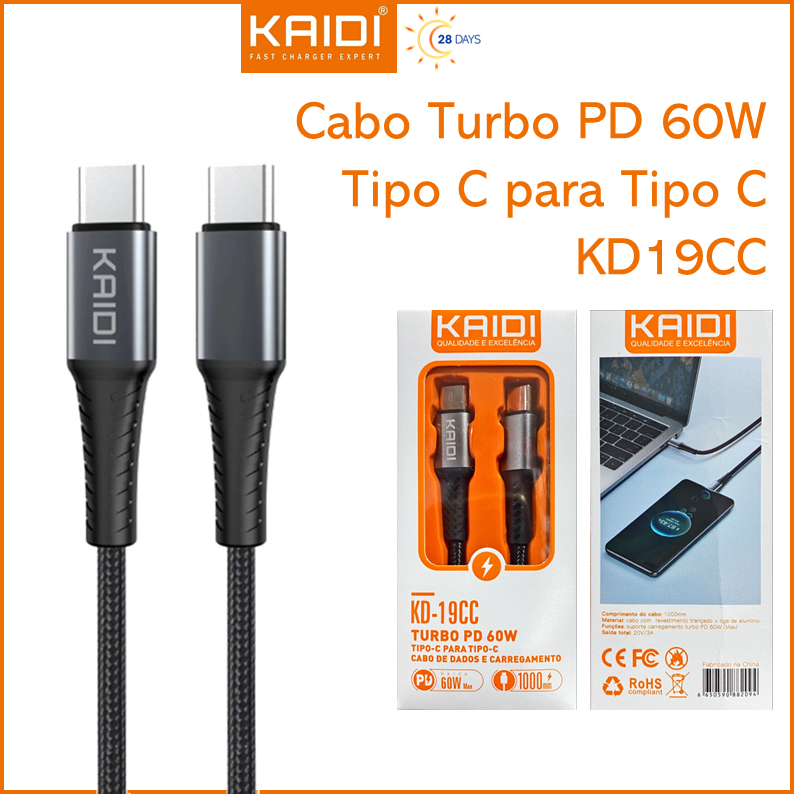 Cabo Dados e Carregamento Turbo PD 60W TIPO-C para TIPO-C KAIDI KD 19CC
