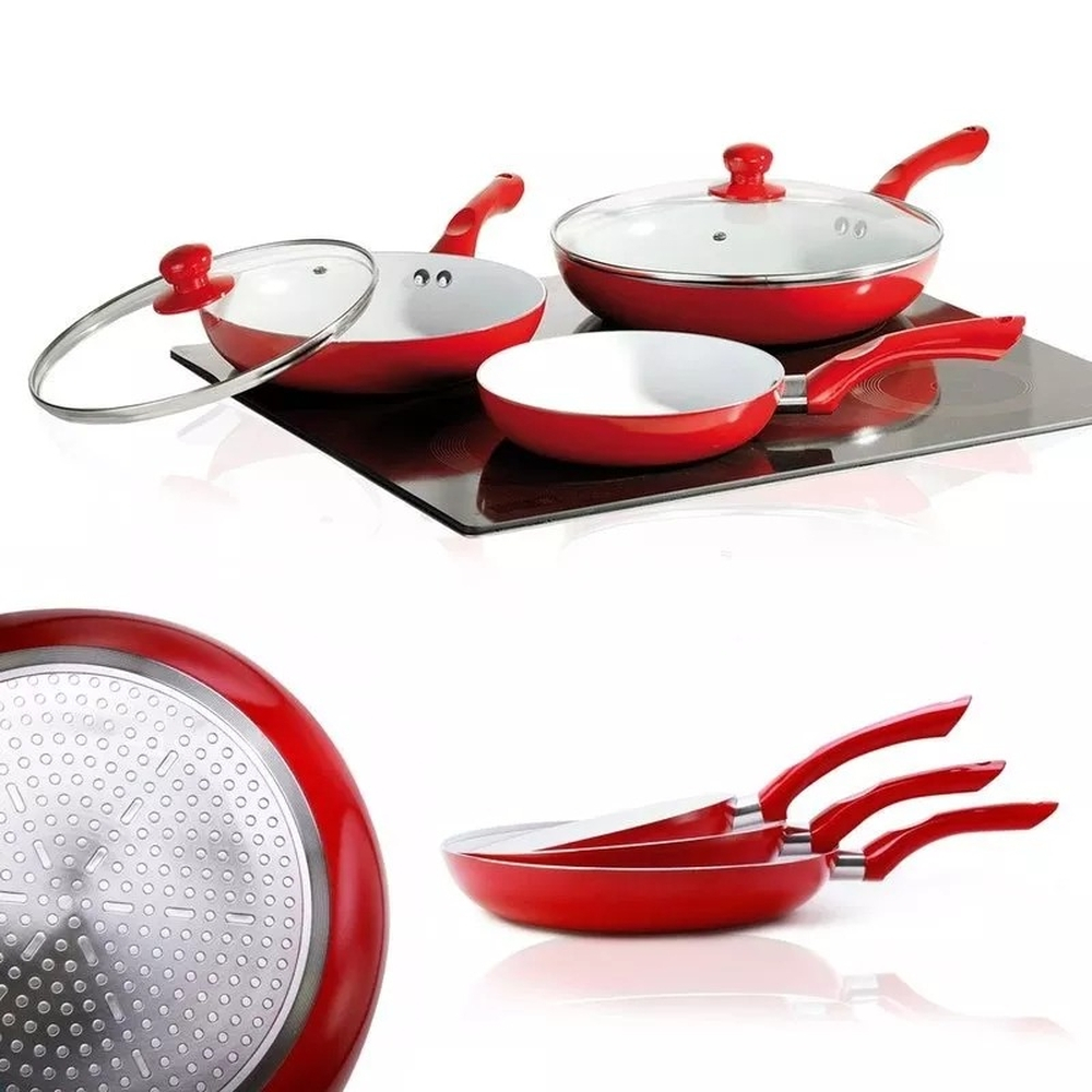 Kit Jogo De Panela Frigideira Revestida Cerâmica Titânio Antiaderente 5 Peças 3 Panelas + 2 tampas