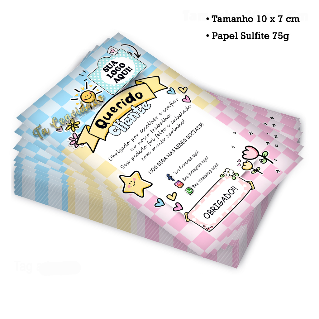 100un - Cartão de agradecimento ao cliente personalizado para enviar junto com seus pedidos - papel sulfite 75g