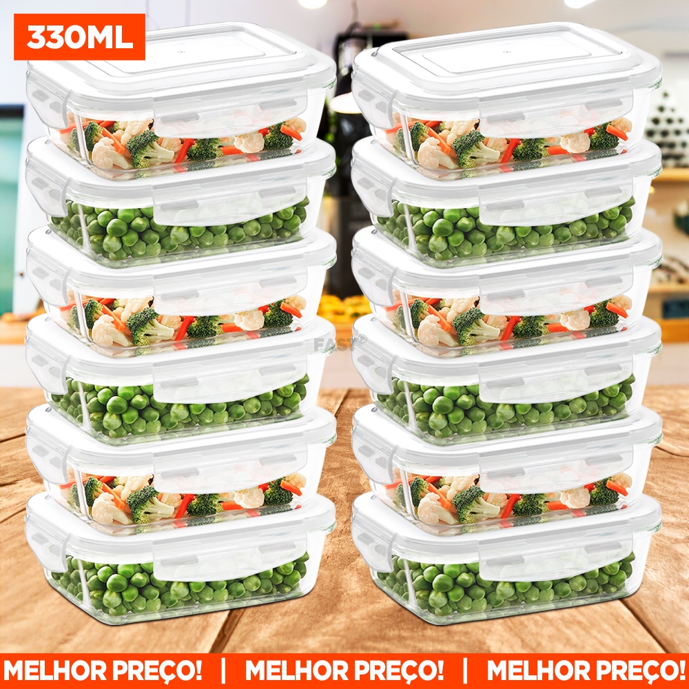 Kit 24 Potes Pote de Vidro Borossilicato Retangular 330ml Com Tampa Trava Hermética Resistente Vai ao Forno Microondas e Freezer Organizadora de Geladeira Marmita Alimentação Fitness Super Vedação em Sílicone