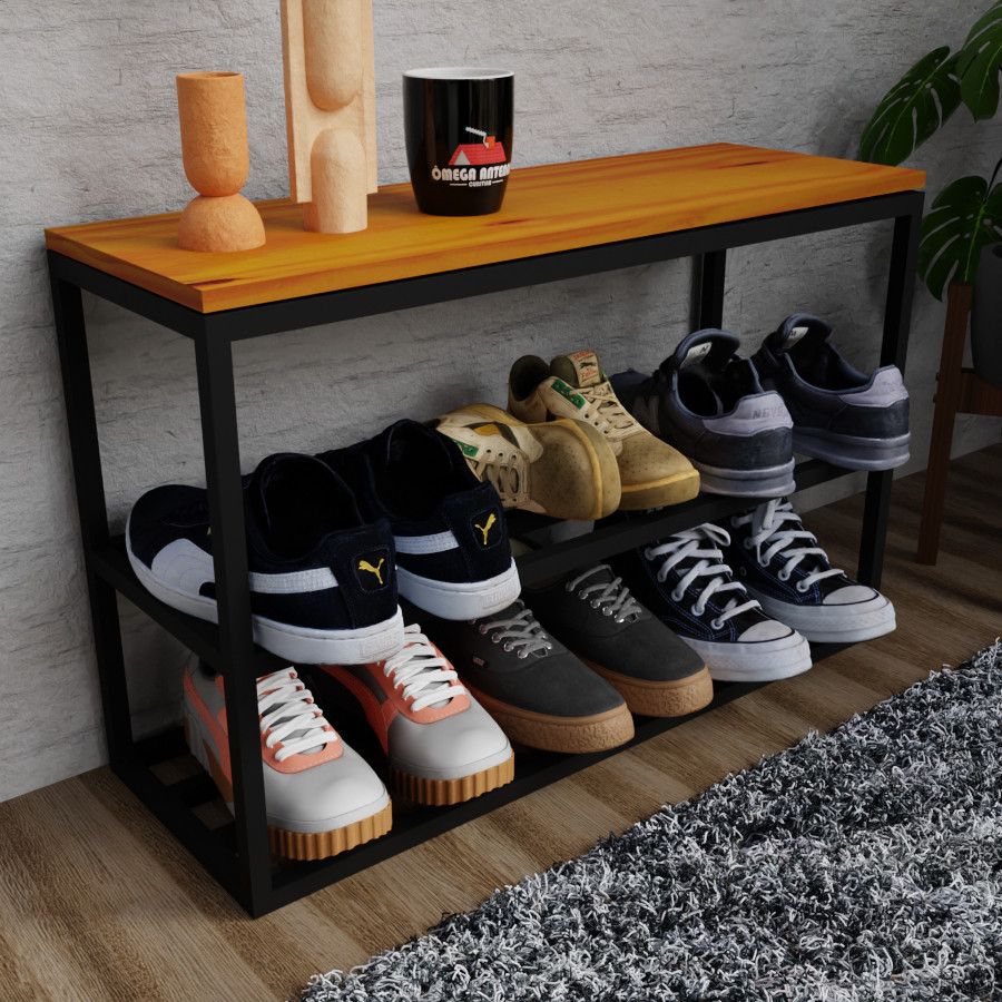 Sapateira Industrial Calçadeira Pequena 6 Pares De Calçados Banco De Chão Assento Madeira Maciça Mini Estante Organizadora 2 Divisões Prateleira Mini Expositora Metal Preto 69cm Hall de Entrada Sala Closet Quarto Sacada Lavanderia