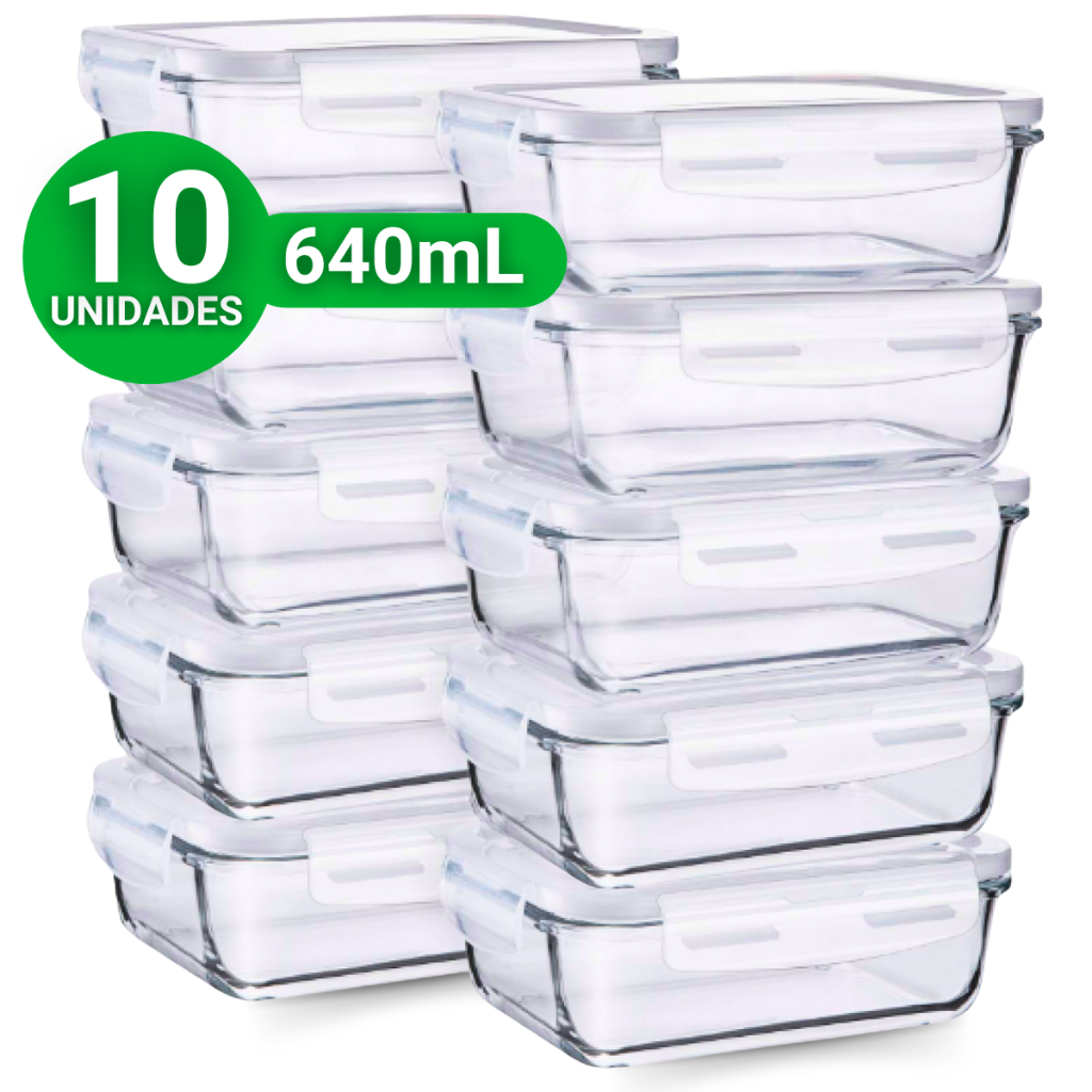 Jogo 10 Pote de Vidro Hermético 640ml Marmita Tampa 4 Travas Potes Herméticos Vidro Temperado