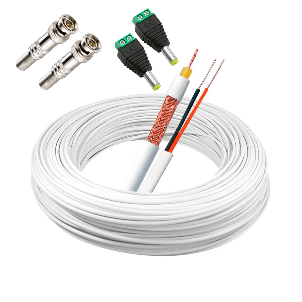 Kit Cabo Cftv coaxial Branco Conector bnc com mola e parafuso 4mm + Plug borne p4 cftv
