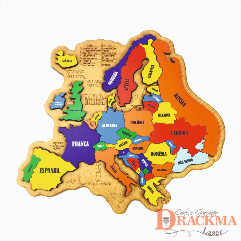 Quebra-Cabeça Mapa da Europa Brinquedo Educativo, Países e capitais em MDF.