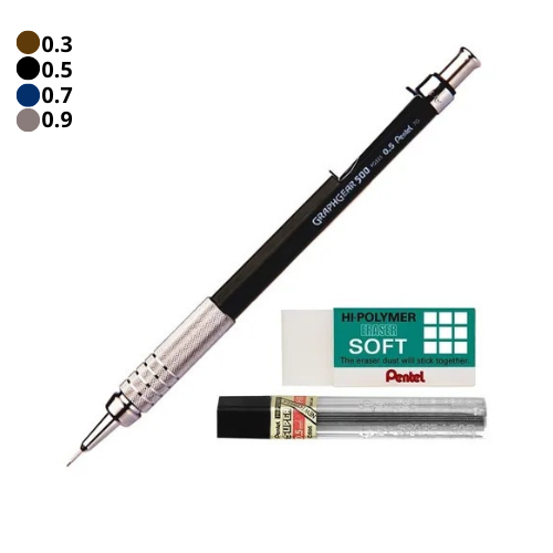 Kit Lapiseira Pentel Graphgear 500 Grafite Borracha - 0.3/0.5/0.7/0.9