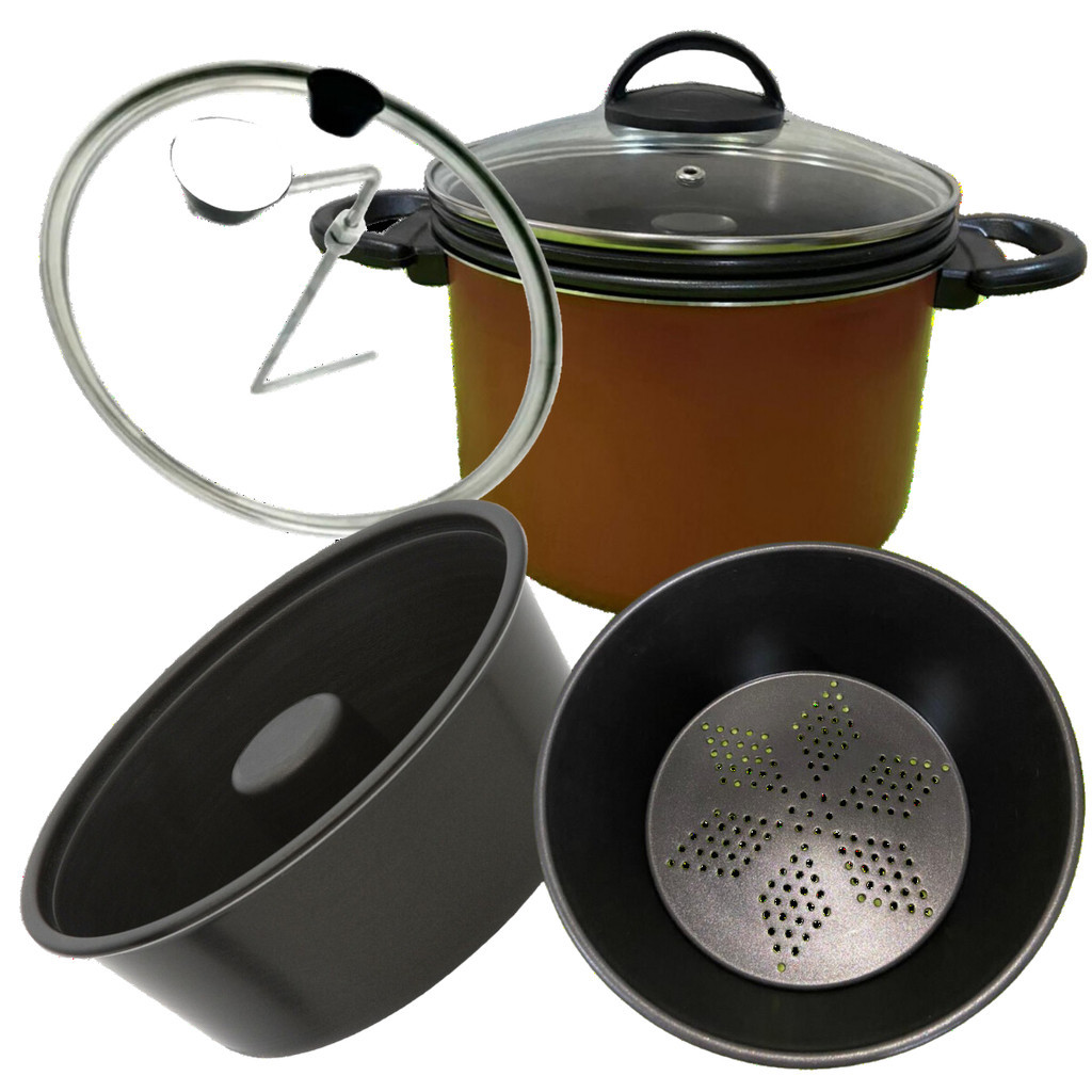 Panela Banho Maria 3 Em 1 Co Tampa de Vidro Vapor Forma Pudim Cuscuz Vermelho e Preto Antiaderente