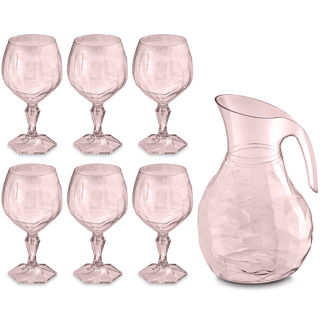 Kit Jarra 2,3L E 6 Taças 350ml Jogo De Plástico Refresco Tango Servir Água Suco Rosa Translúcido UZ