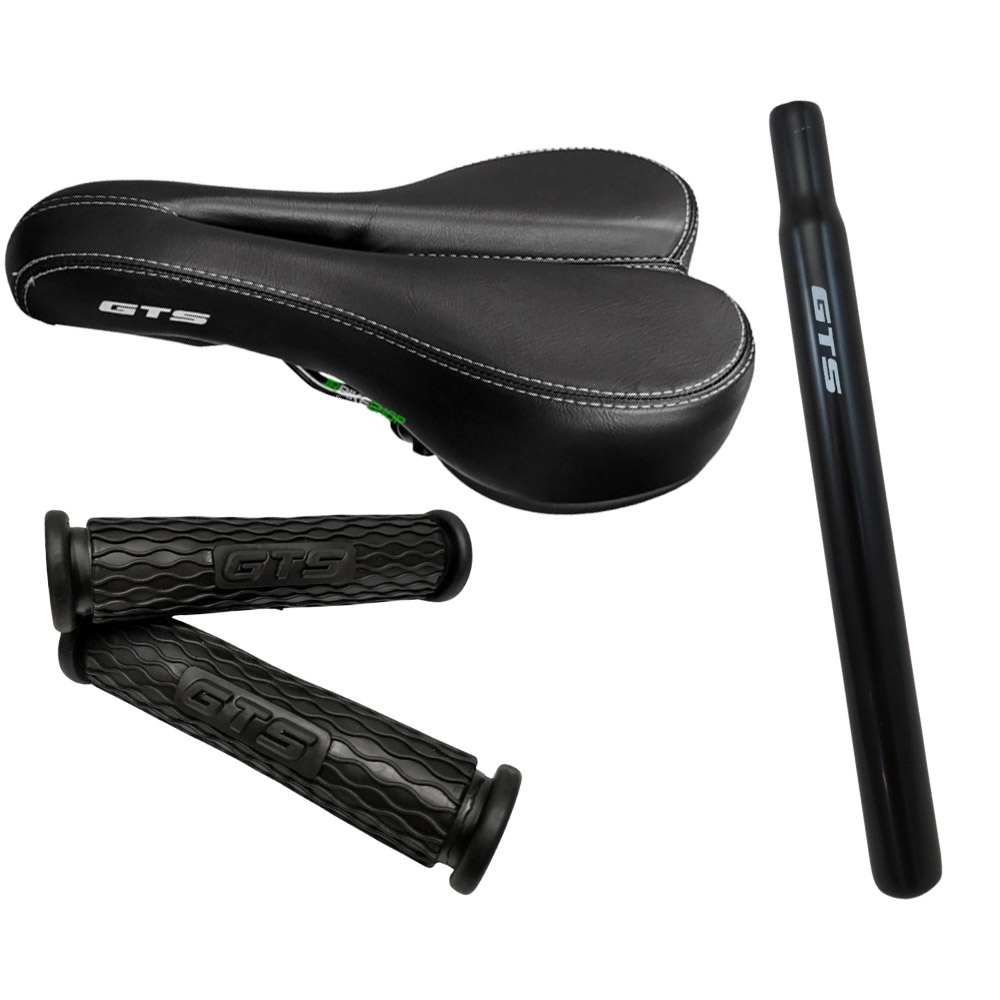 Selim Banco Sela Gts Vazado + Canote Aço e Manopla Borracha - Preto Bike Mtb/Speed