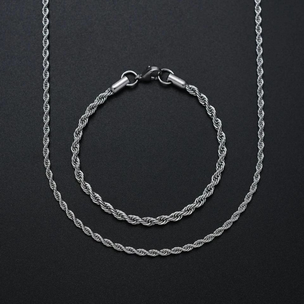 Kit Cordão Baiano + Pulseira 4mm Masculina Corrente Aço Inox Prata Colar Cordão Trançado Baiano + pulseira 70cm