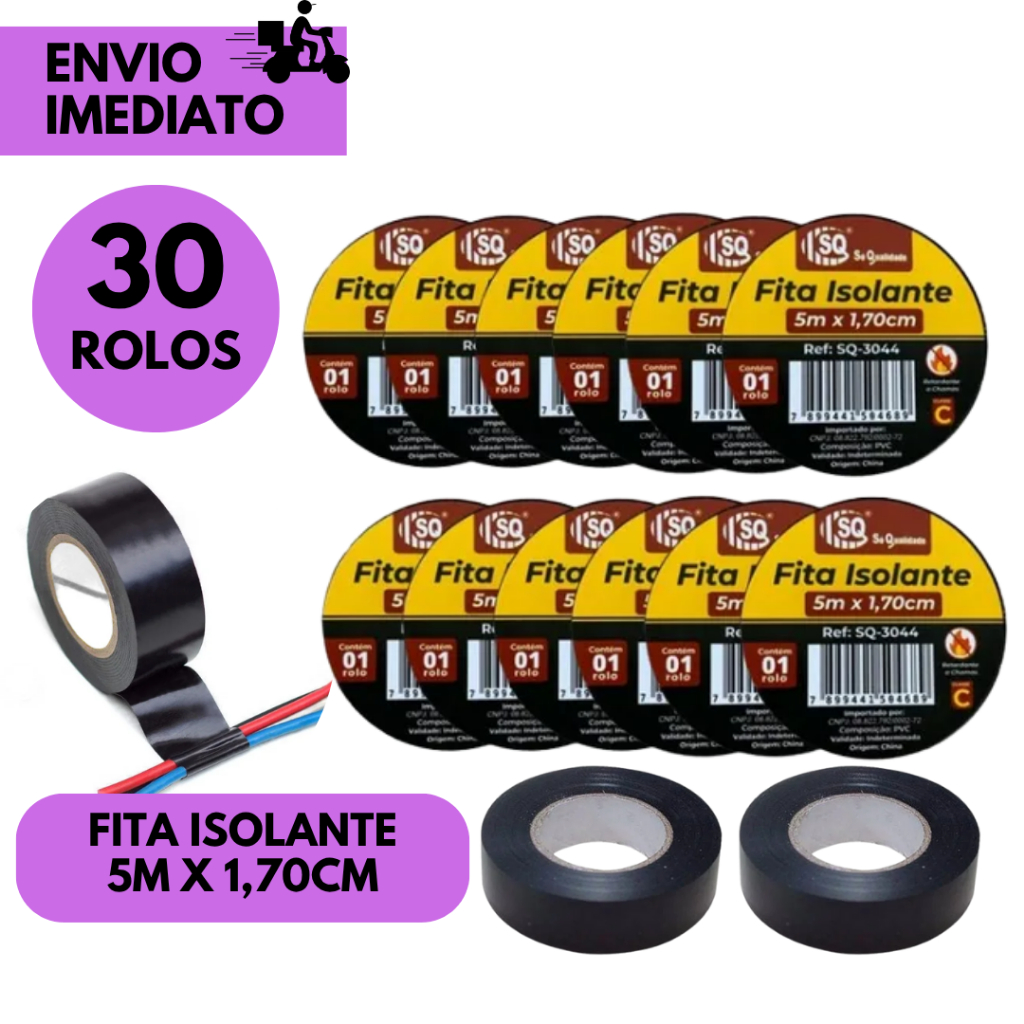 Kit 30 Rolos Fita Isolante Preta 5 Metros x 1.7cm Alta Qualidade Uso Elétrico Resistência Durável
