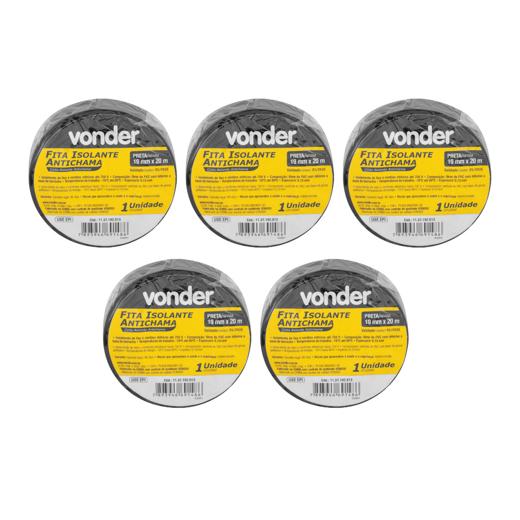Kit 5 fitas isolante, 19 mm x 20 metros preta - VONDER