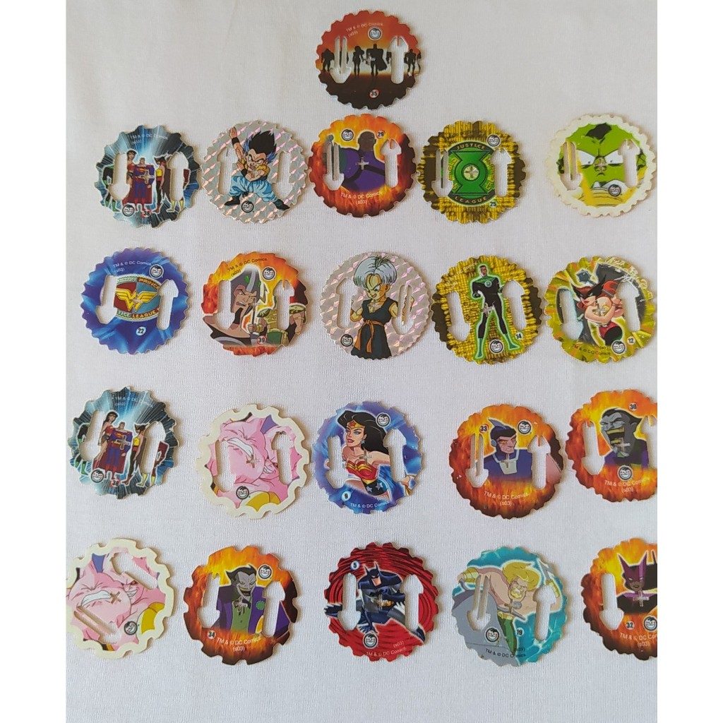 LOTE COM 21 TAZOS PIÃO ELMA CHIPS LIGA DA JUSTIÇA DRAGON BALL