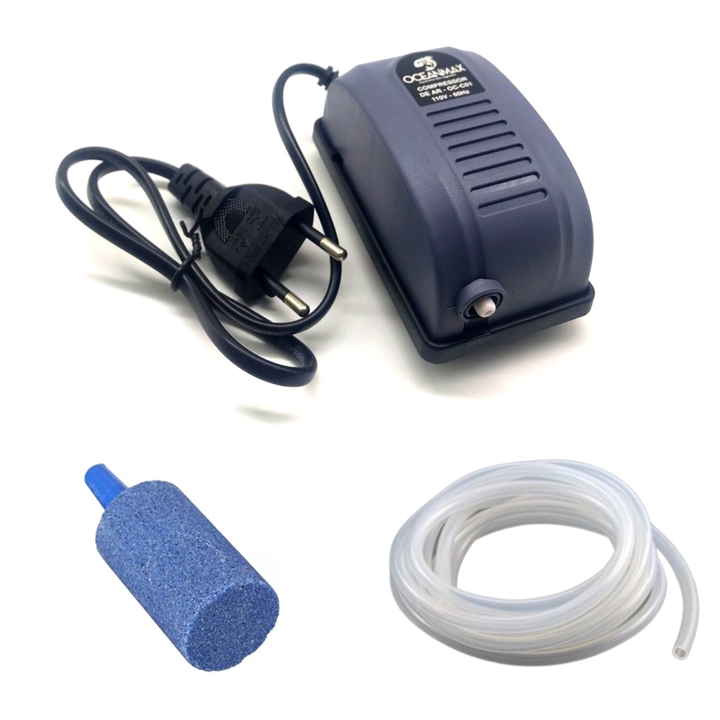 Kit Bomba De Ar Oxigenador Compressor OceanMax Para Aquários Completo Com Pedra Porosa e 1,5m de Mangueira