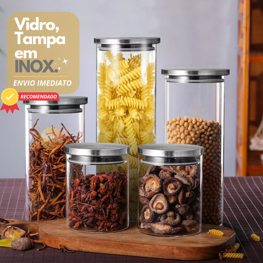 Kit 5 Potes de Vidro com Tampa Inox hermético Redondo Porta Condimentos