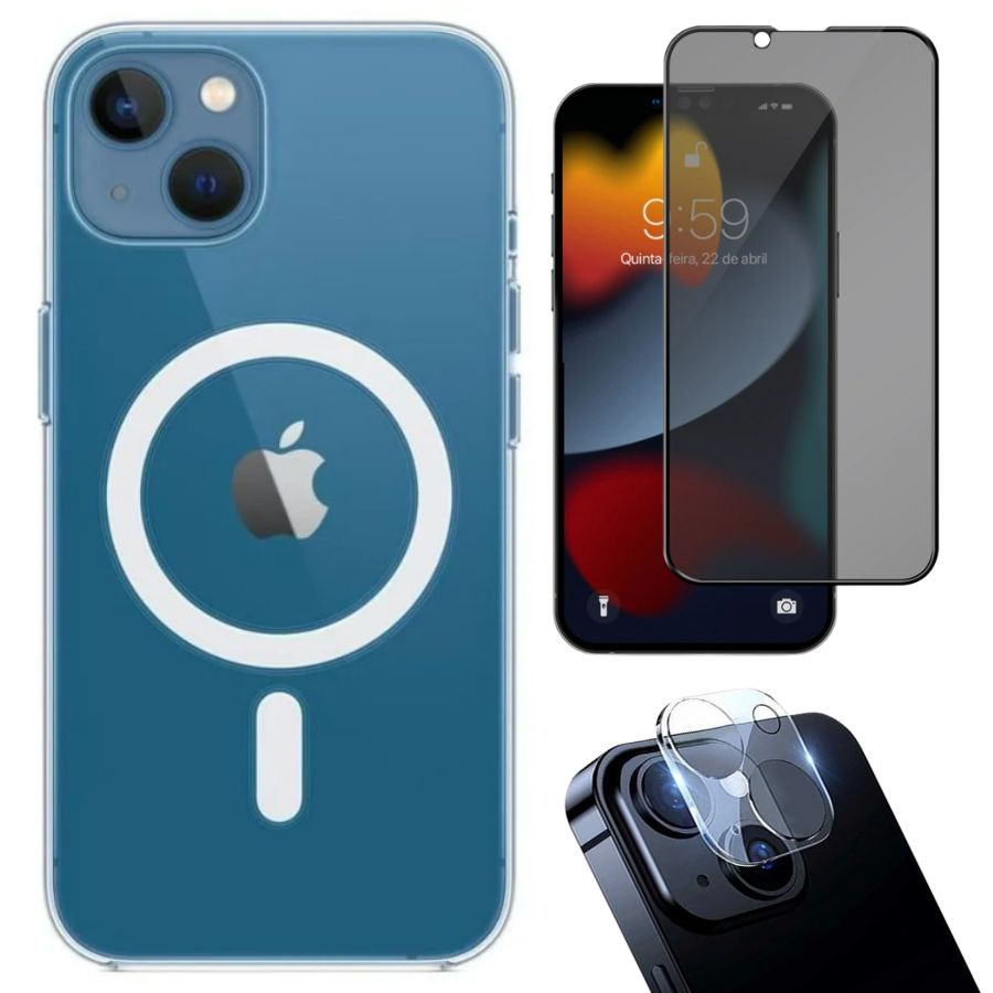 Kit 3em1 Capa Capinha Magnetica MagSafe + Pelicula 3D Privacidade + Pelicula de Camera Compativel Com iPhone 13