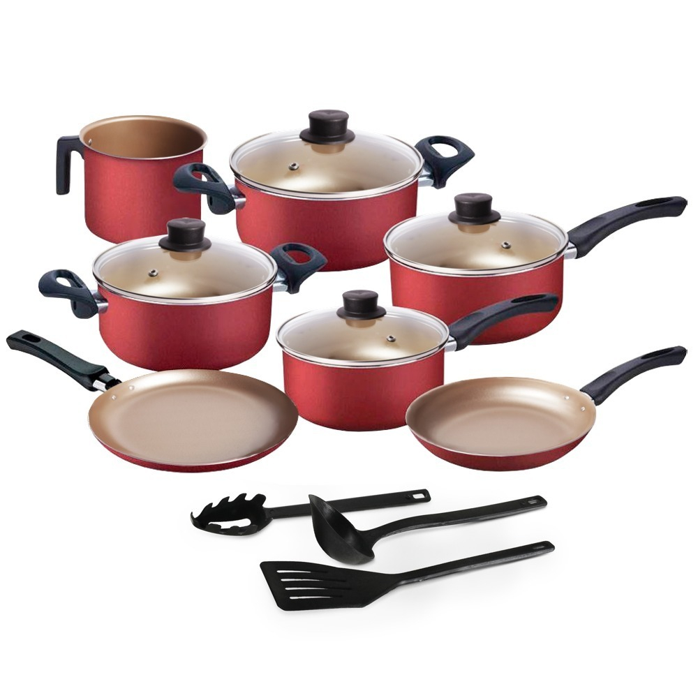 Jogo De Panelas Plus 10 Peças Caçarolas 16 a 24 cm Antiaderente Teflon com Tampa de Vidro Cereja e Dourado
