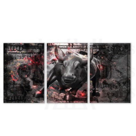 Kit Quadros Decorativos Mosaico 3 Peças Touro de Wall Street Nota Milhão Reais Dólar Bolsa de Valores Milionário Bilionário Famoso Moderno Nota Cédula