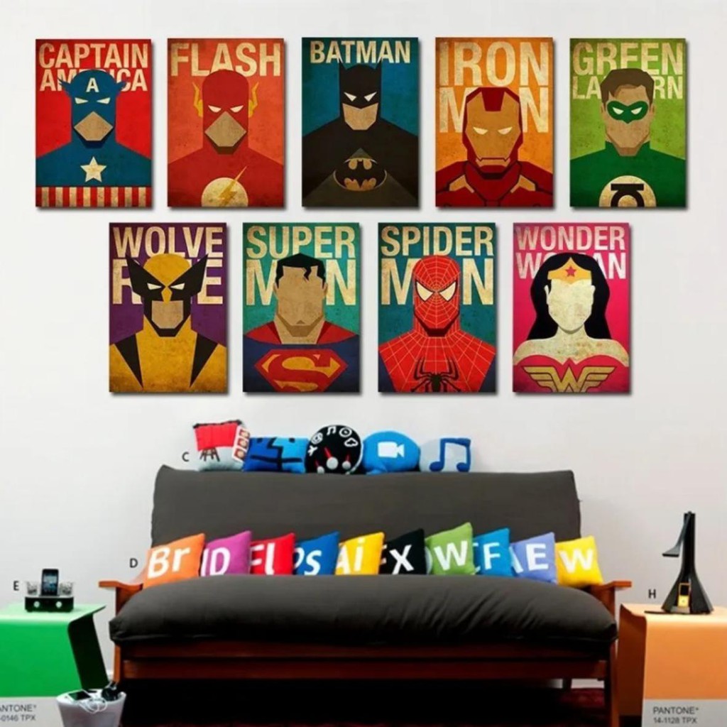 Kit Quadros Decorativos 10 Peças Super Heróis Marvel Capitão América Homem de Ferro Batman Super Man