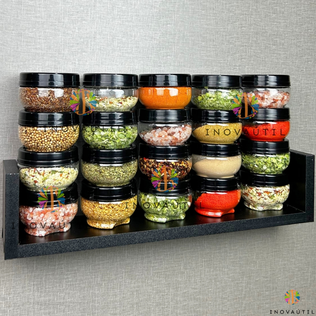Kit Porta Tempero 20 Potes de 155ml Com Prateleira MDF Para Pendurar ou Bancada Condimento