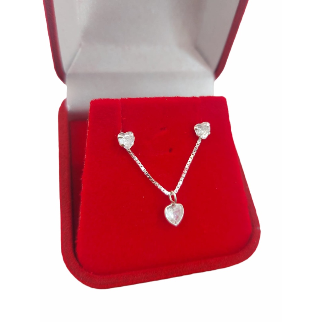 Kit Colar+Brincos Corrente de Prata 925 Legítima Pingente Coração CRISTAL Com Ponto de Luz Pedra Zircônia Veneziana Jogo