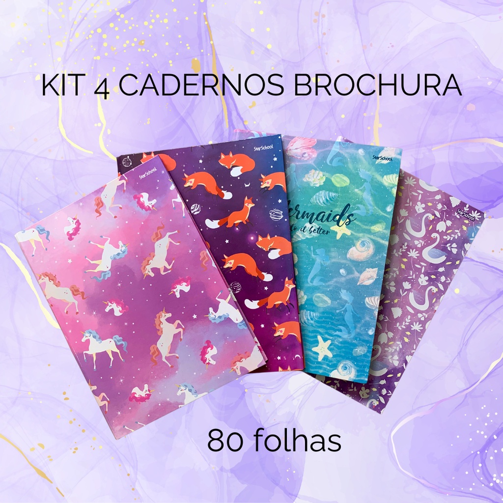 Kit 4 Cadernos Universo Brochura Capa Dura Feminino Infanto Juvenil 1 Matéria 80 folhas Grande Modelos Variados