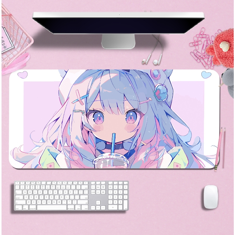 Mouse Pad Gamer p/ Desktop Borda Costurada Estampas Rosa Meninas Kawaii