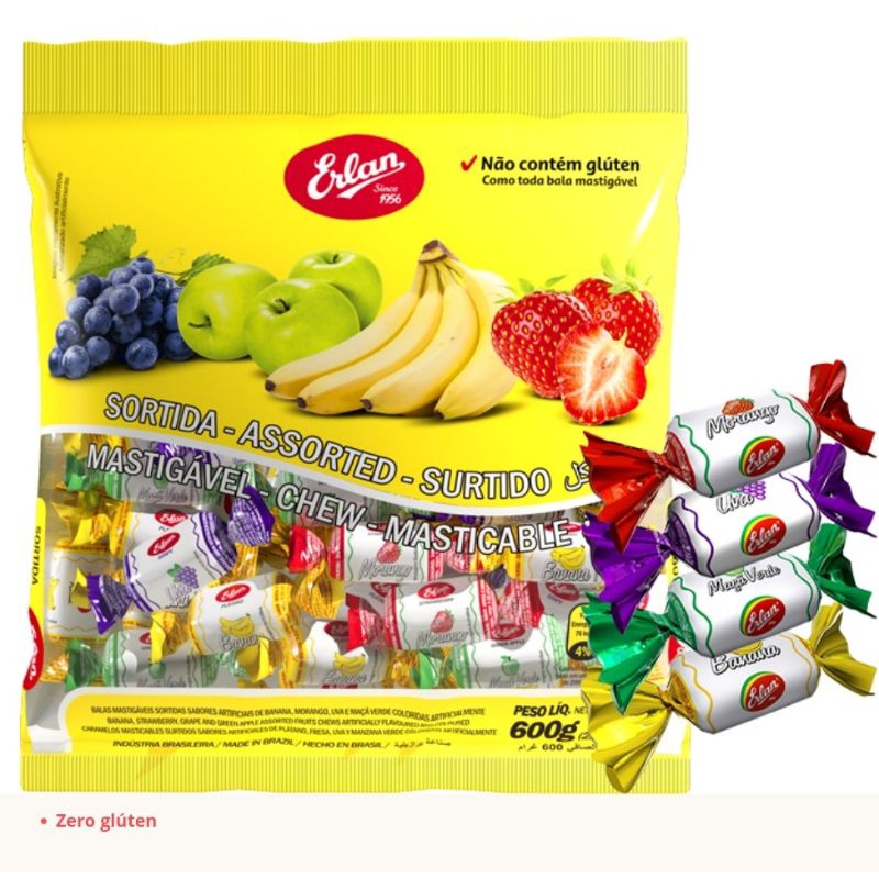 Bala Macia Erlan mastigavel ,sabores sortidos,pacote de 500 gramas