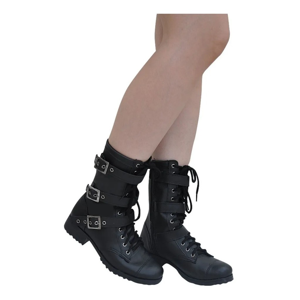 Bota Coturno Feminino Cano Médio Moda Pé Punk Rock Estilo Militar 3 Fivelas Cor Preta