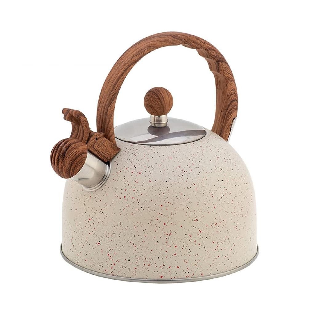 Chaleira de Aço Inox Com Apito e Cabo Amadeirado Bege Marmol Retrô Gás ou Indução 2 Litros Café Chá Água com Alça Mimo Style Bule Utensilios de Cozinha