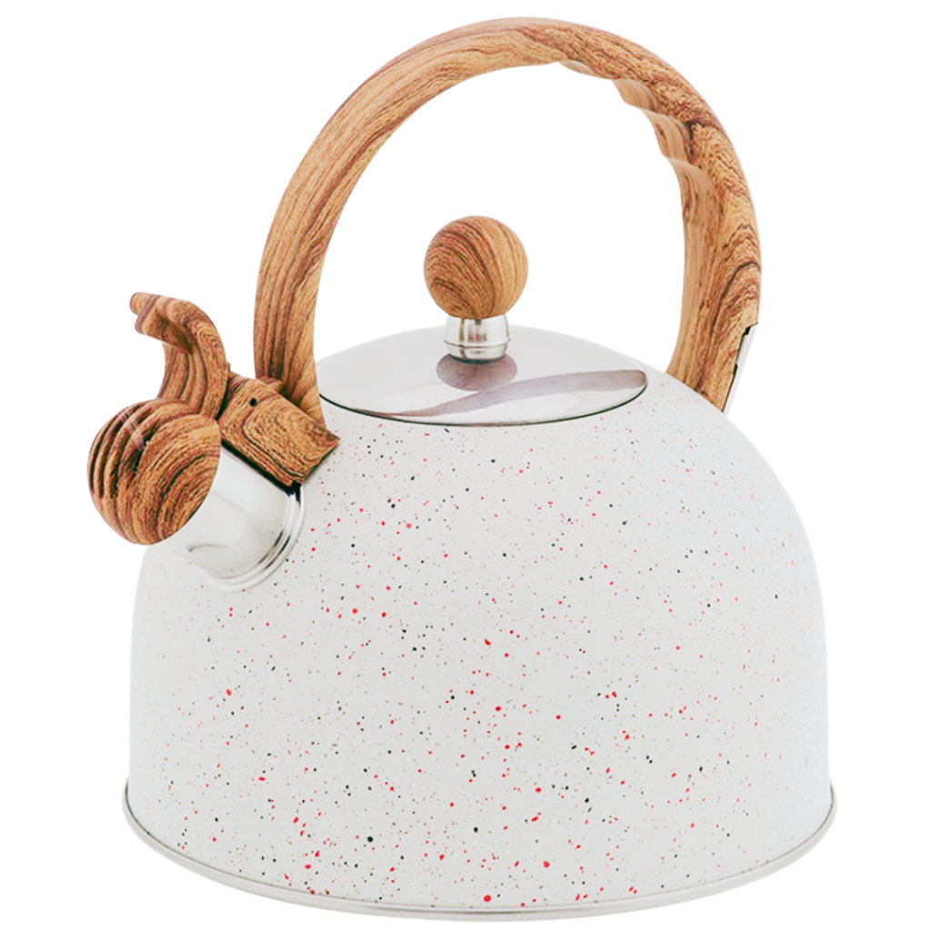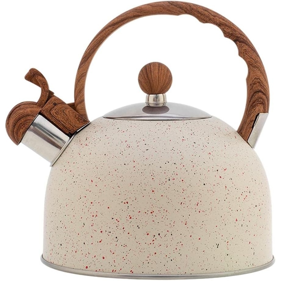 Chaleira de Aço Inox Com Apito e Cabo Amadeirado Bege Marmol Retrô Gás ou Indução 2 Litros Café Chá Água com Alça Mimo Style Bule Utensilios de Cozinha