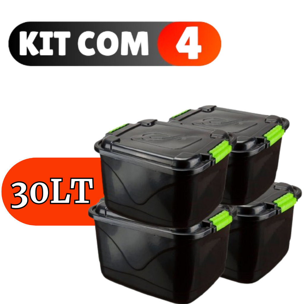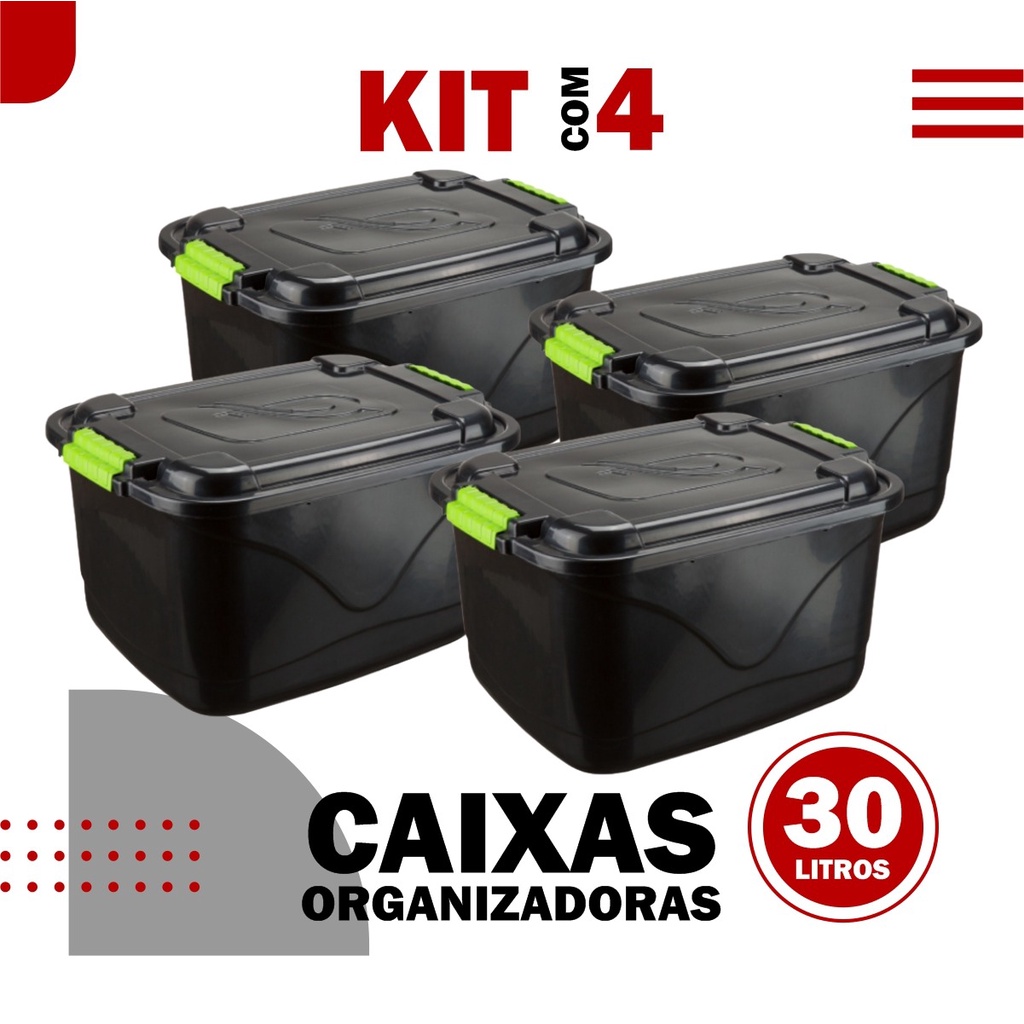 Kit 4 Caixas Organizadora 30l Grande C/Tampa e Trava Cesto para Brinquedos e Multiuso