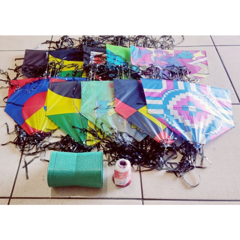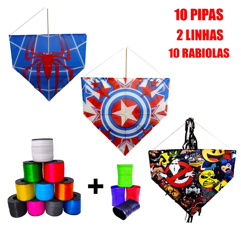 Pipa Kit 10 Pipas Com Rabiola Mais 2 Linha de Pipa e Lata Prontos para Soltar