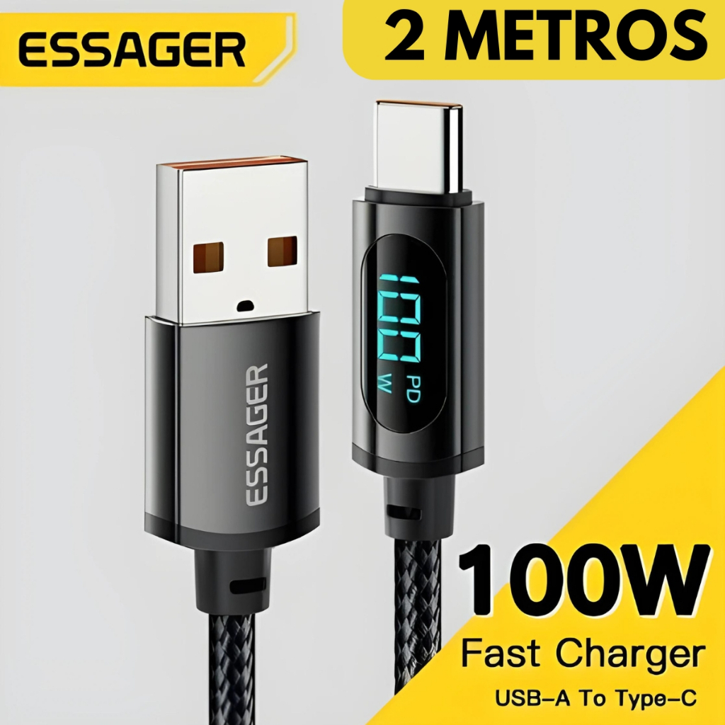 Essager Cabo LED USB para Tipo-C, 2 Metros Cabo em Nylon, 100W, 7a, com Visor de Voltagem.