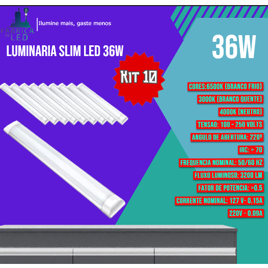 Kit 10 Luminaria linear led slim 36/40w 120cm 3000K/ 4000K/ 6500K Tubular sobrepor calha
