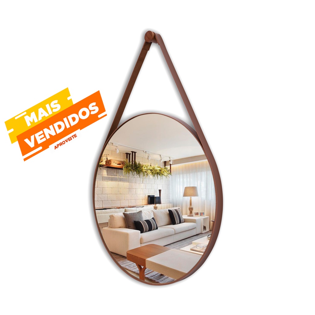Espelho Redondo Adnet 40 cm Sala / Quarto / Banheiro / Com Alça Couro Suporte e Pendurador