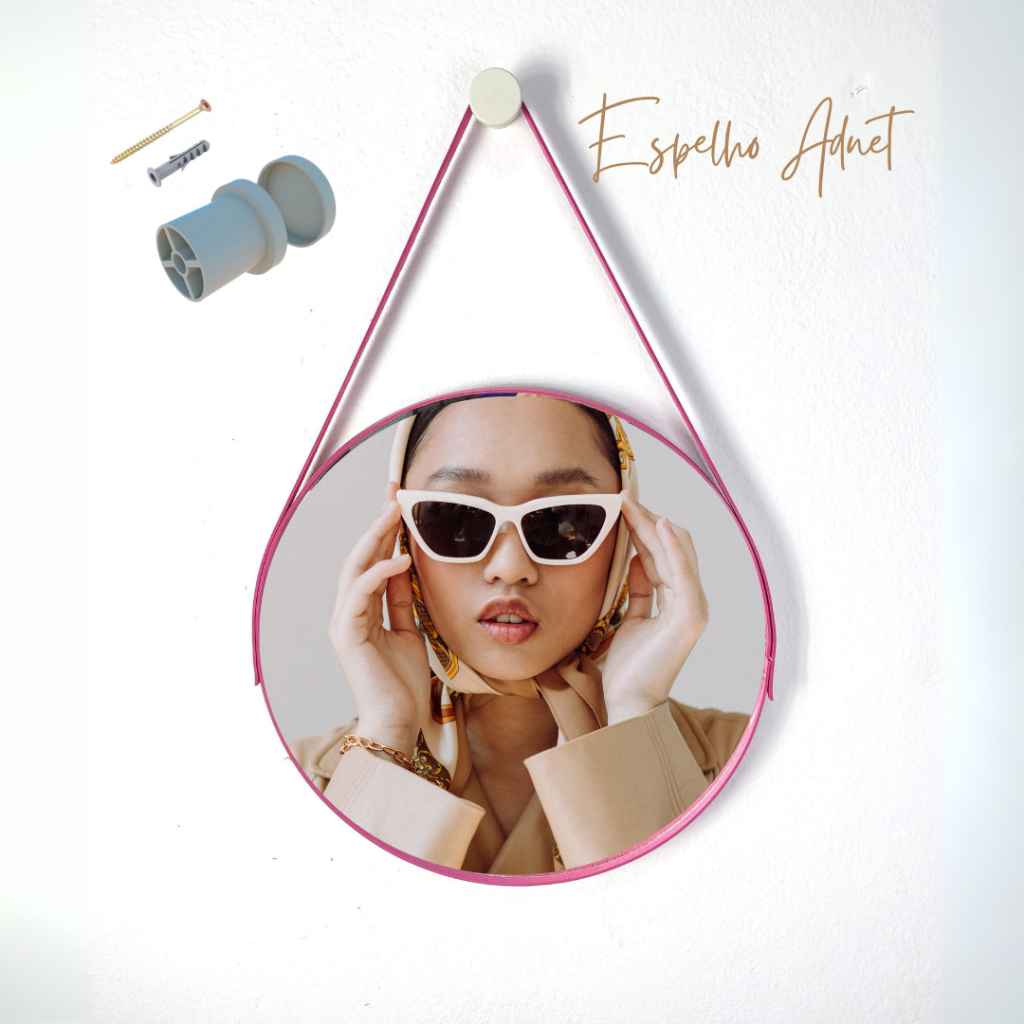 Espelho Adnet Decorativo, Com Alça de Couro na Cor Rosa + Suporte. Tamanhos 30,40,45,50 e 60cm