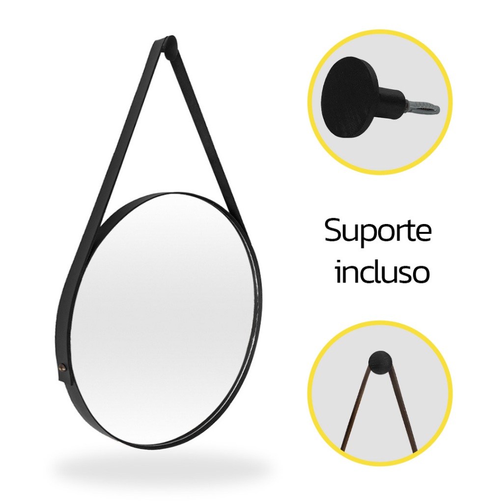 Espelho Moderno Redondo Lavabo Alça Em Couro Adnet 40 e 60cm + Suporte Pendurador