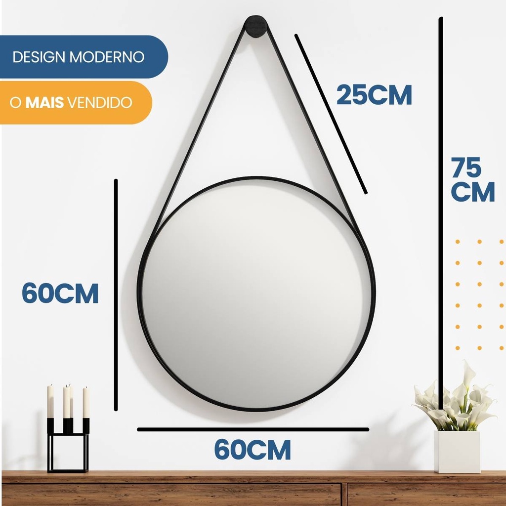 Espelho Redondo 60cm com Alça em Couro e Suporte para Banheiro Sala Quarto