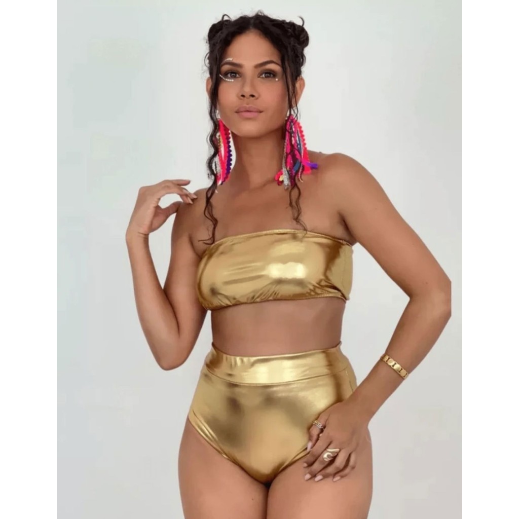 Conjunto 2 Peças Metalizado Carnaval Calcinha Top Faixa Shorts Cropped Brilhoso Festa Piscina Fantasia Hot Pants feminin